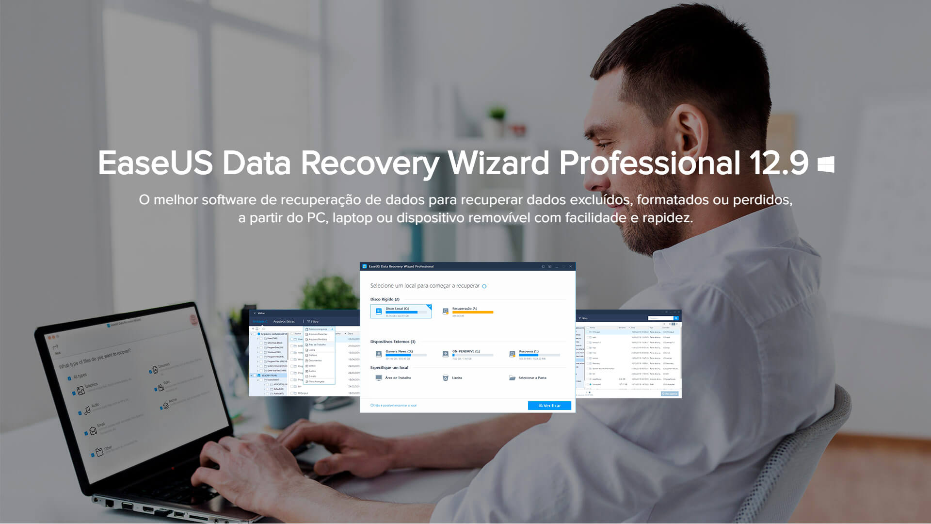 Você sabia que existe um programa para recuperar arquivos capaz de vasculhar seu HD, HD Externo, SSD, Pen Drive, Cartão de Memória e muito mais? A desenvolvedora EaseUS Software tem mais de 14 anos no mercado e mais de 10 milhões de clientes em todo o mundo. E adivinhe, ela tem a solução para os seus problemas. Estamos falando do EaseUS Data Recovery Wizard Professional. Este programa é capaz de recuperar seus arquivos importantes. Mesmo que você os tenha perdido sem querer ou por erro de formatação. Aliás, ele também recupera arquivos perdidos em danos no HD, partições excluídas e até ataque de vírus. Além disso, o programa é completamente em Português do Brasil, além de outros idiomas disponíveis.