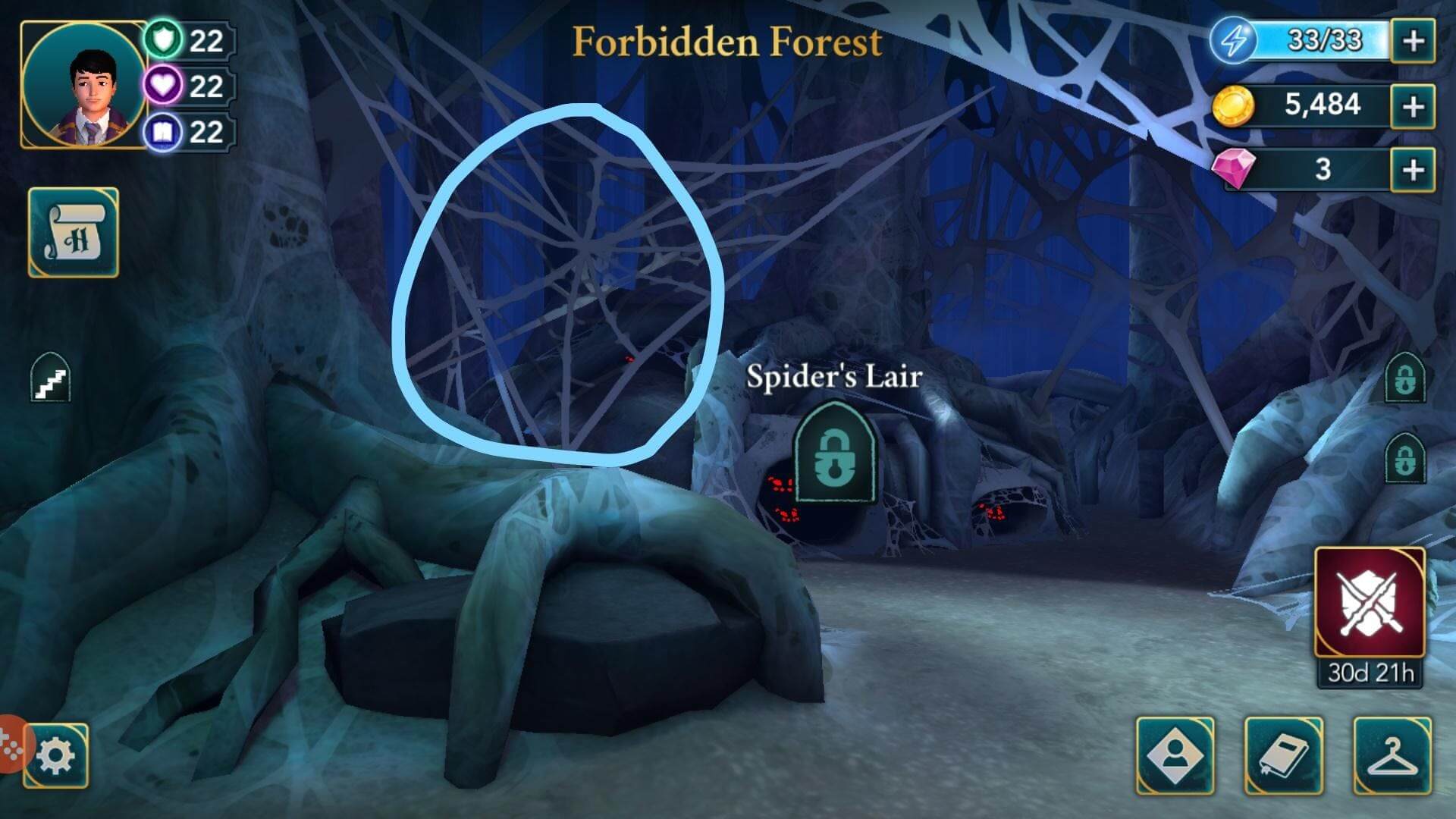 • Floresta Proibida: Interaja com a teia de aranha em formato triangular, na entrada do ninho. Uma aranha sairá de lá.
