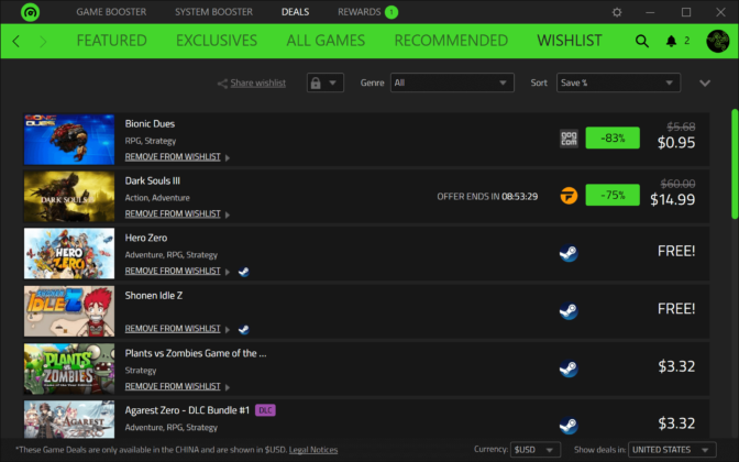 O Razer Cortex: Deals é uma ferramenta que compara os preços de games digitais em todas as principais lojas do gênero e reúne tudo em um único lugar. Na nova versão do Razer Cortex, esse recurso está ainda mais rápido e prático graças a um motor de busca que monitora os preços dos jogos favoritos dos usuários em tempo real.