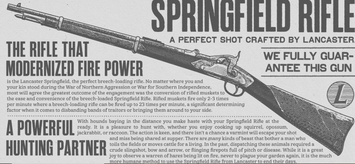 A Rockstar Games, produtora de Red Dead Redemption 2 divulgou mais detalhes sobre as armas do jogo em seu site oficial. De acordo com ela, estarão disponíveis mais de 50 armas exclusivas. Além disso, elas poderão ser personalizadas com diferentes cores e tipos de munição que melhorarão a precisão, o alcance ou os danos. Aliás, as armas se degradarão com o tempo se não forem cuidadas, lubrificadas e limpas.