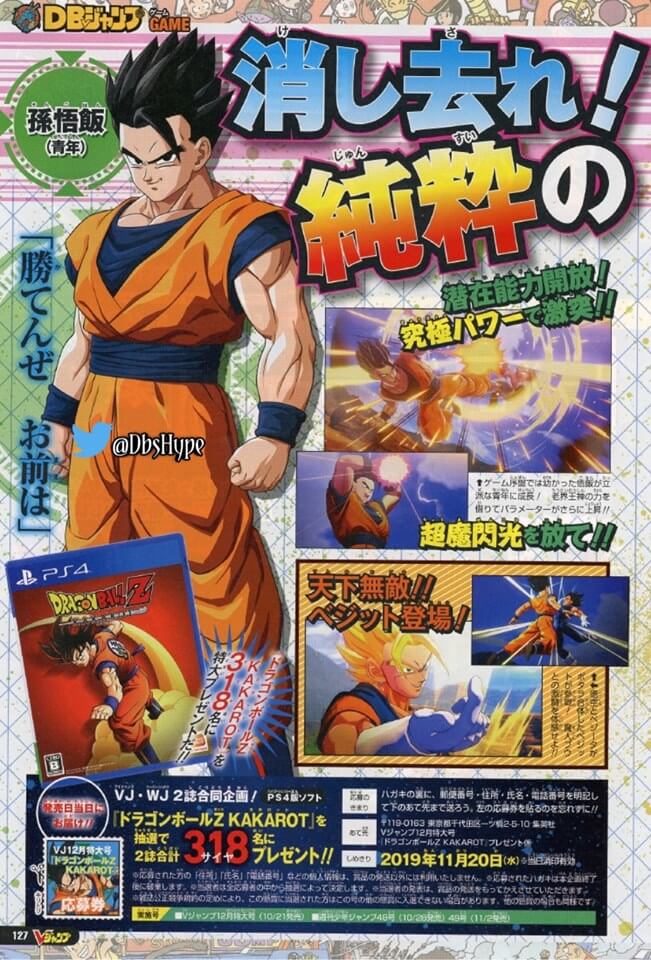 De acordo com a revista Weekly Jump, os personagens Vegito e Gohan adulto, estarão jogáveis em Dragon Ball Z: Kakarot. O novo título da Bandai Namco será lançado em 17 de janeiro para PlayStation 4, Xbox One e PC.